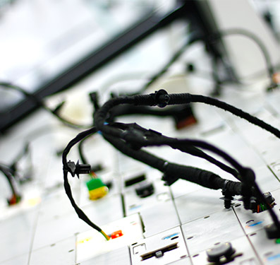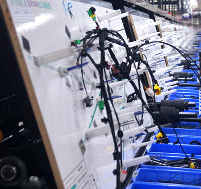 車間配有全自動裝配生產(chǎn)流水線,有專業(yè)非標(biāo)定制的線束圖板裝置;圖板上標(biāo)示有布線路徑且配置有布線夾具,通過沿著布線路徑進行布線來裝配線束,能夠滿足快速更換產(chǎn)品型號的需要。